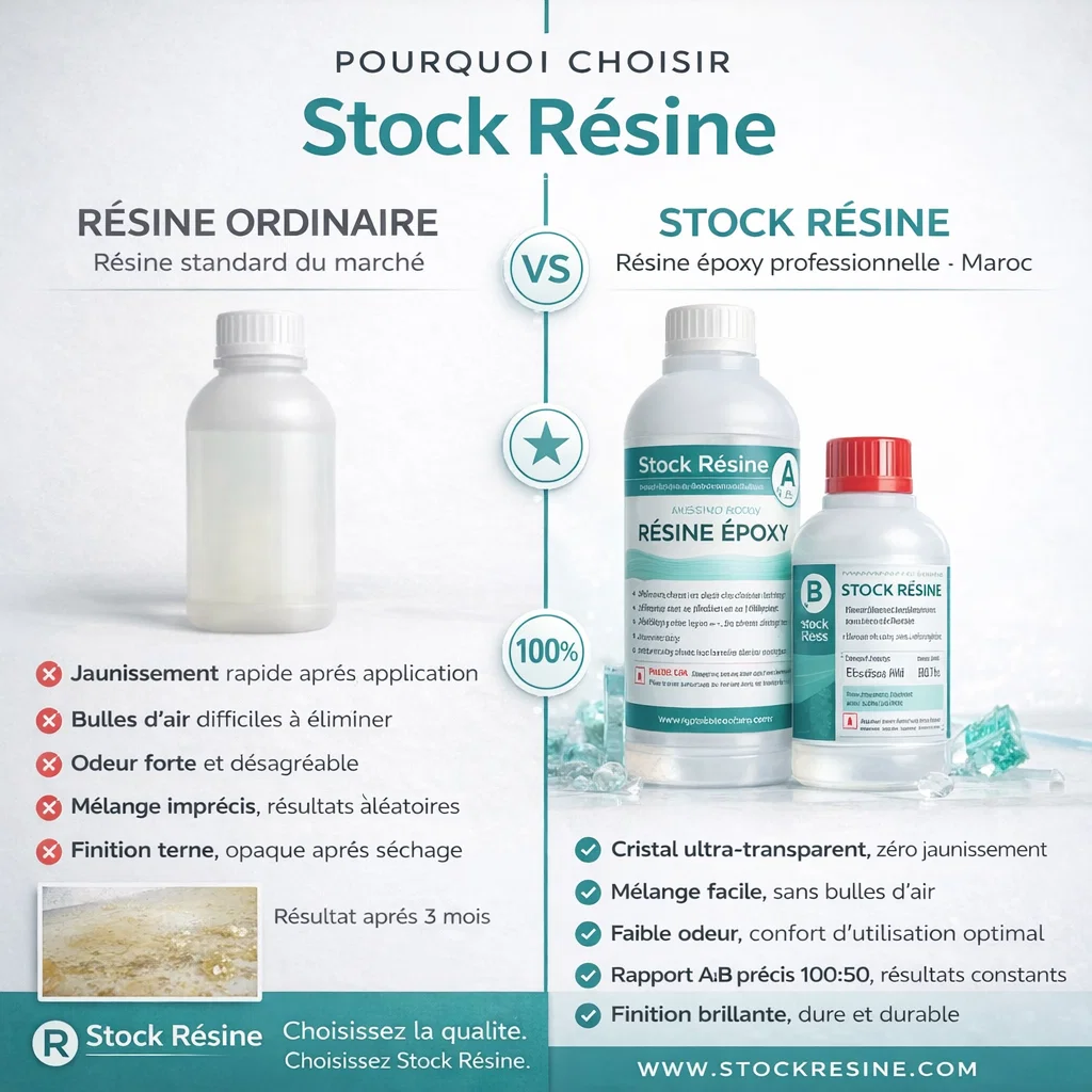 Notre résine époxy transparente A+B est formulée pour les créateurs marocains exigeants — débutants comme professionnels.